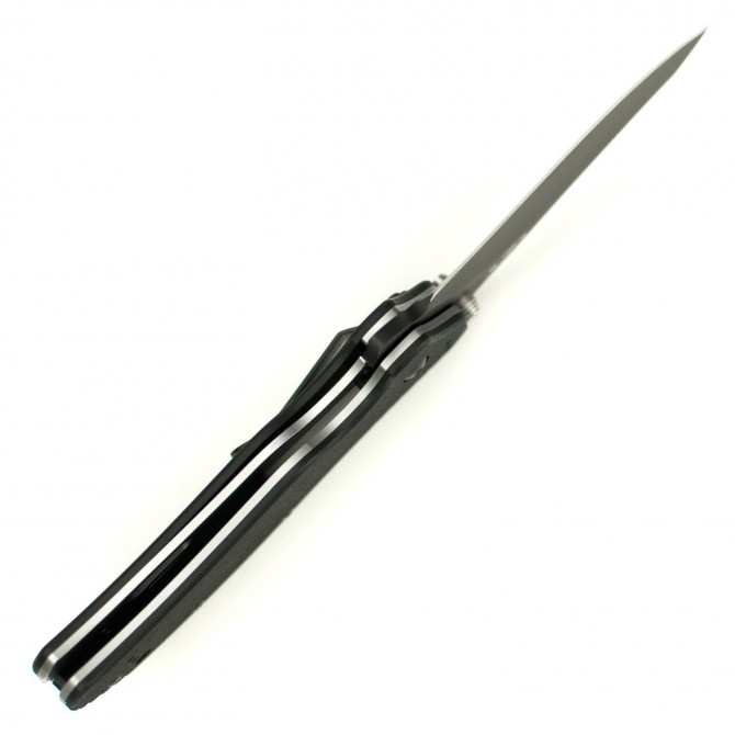 La cacha está fabricada de G10 texturizadas en negro mate, para resistir a altas temperaturas e impermeable. Además tiene una estructura ergonómica que mejora el agarre de la navaja y provoca una reducción muy amplia de fatiga en el uso continuo y prolongado a largo plazo.