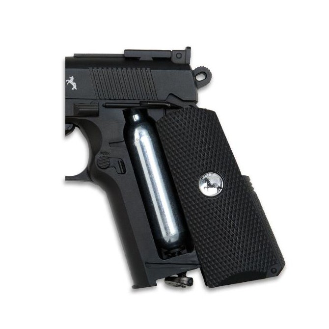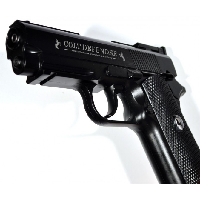 La Colt Defender es una pistola semi-automática que cuenta con un cañón liso y una corredera fija. Dispone de una capacidad del cargador de 16 BBs. Incorpora cuerpo recubierto con diseño Full Metal. Incluye miras abiertas y un raíl Cola de Milano.