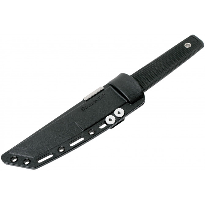 Los desarrolladores de Cold Steel han equipado a este cuchillo Kobun con una funda de polímero Secure-Ex. Se trata de un material mucho más resistente que el cuero en cuanto a cortes y pinchazos. Además, no se pudre ni se enmohece.