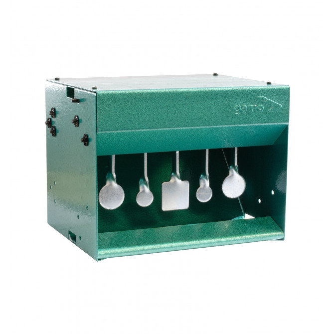 Esta Diana de Gamo contiene cinco péndulos o blancos individuales. Dos discos exteriores de 25mm, dos discos interiores de 19mm y el disco central, un péndulo cuadrado de 32mm. Cuando un objetivo es alcanzado, el disco sube y se queda escondido. Para volver a hacerlos aparecer hay que acertar al péndulo cuadrado del medio.