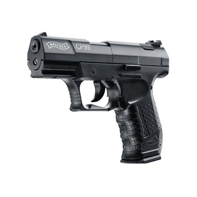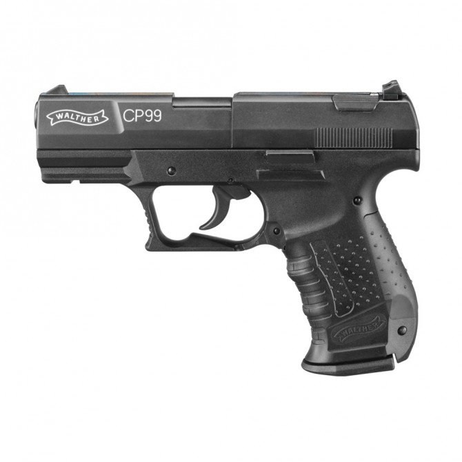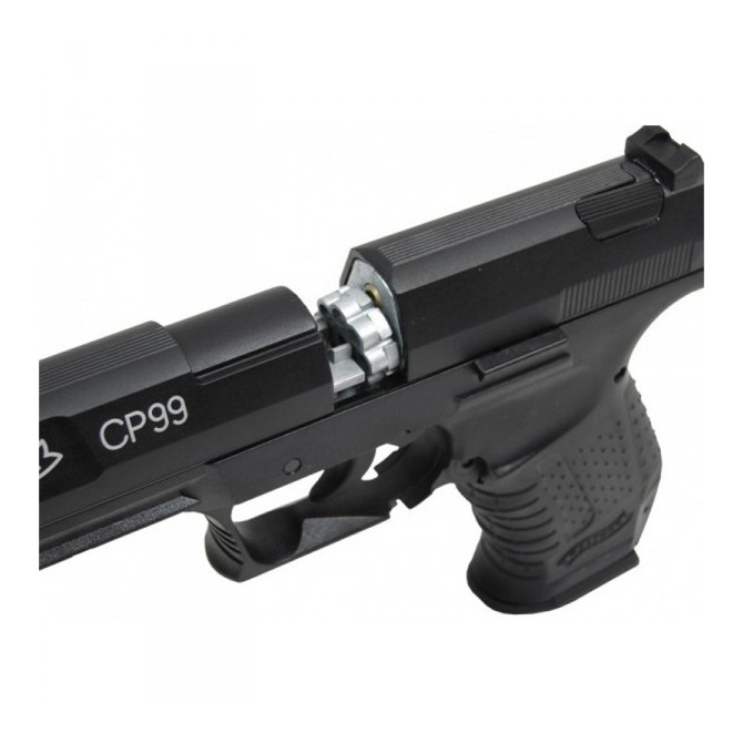 Pistola de CO2 Walther CP99 con sistema de carga interno alimentado por bombonas de CO2 de 12 gramos. Incorpora una tecnología semi-automática con cargador con capacidad para 8 balines. Incorpora cañón de acero estriado, miras abiertas y gatillo ajustable de simple y doble acción.
