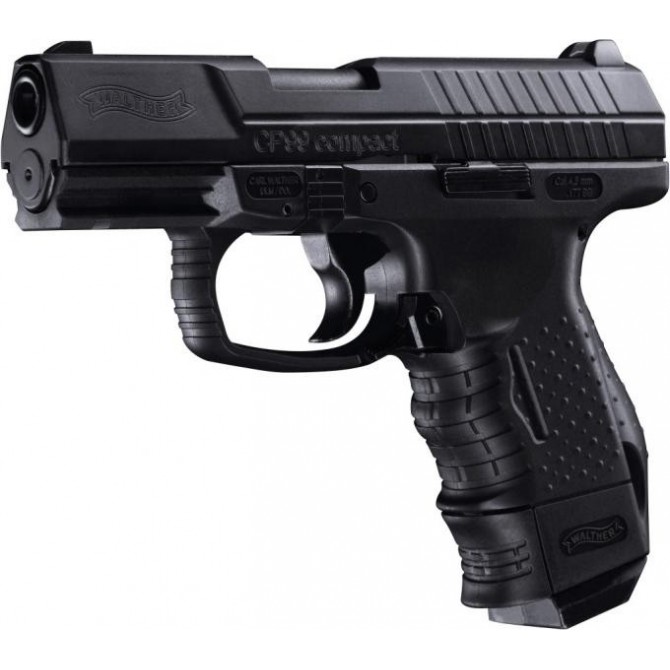 La Walther CP99 Compact Co2 es una pistola semi-automática, que tiene un cañón liso y corredera blowback. Contiene un cargador con capacidad para 18 BBs e incluye Raíl Picatinny y miras fijas. Tiene el logotipo del fabricante serigrafiado en la corredera y la empuñadura. Además, incorpora una estructura picada anti-fatiga.