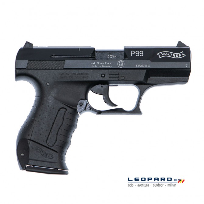 La pistola detonadora Walther P99, fabricada por Umarex en Alemania, dispara munición P.A.K. de 9mm y el cargador tiene una capacidad de 15 cartuchos de fogueo. Incorpora gatillo de simple y doble acción y seguro Decocker.