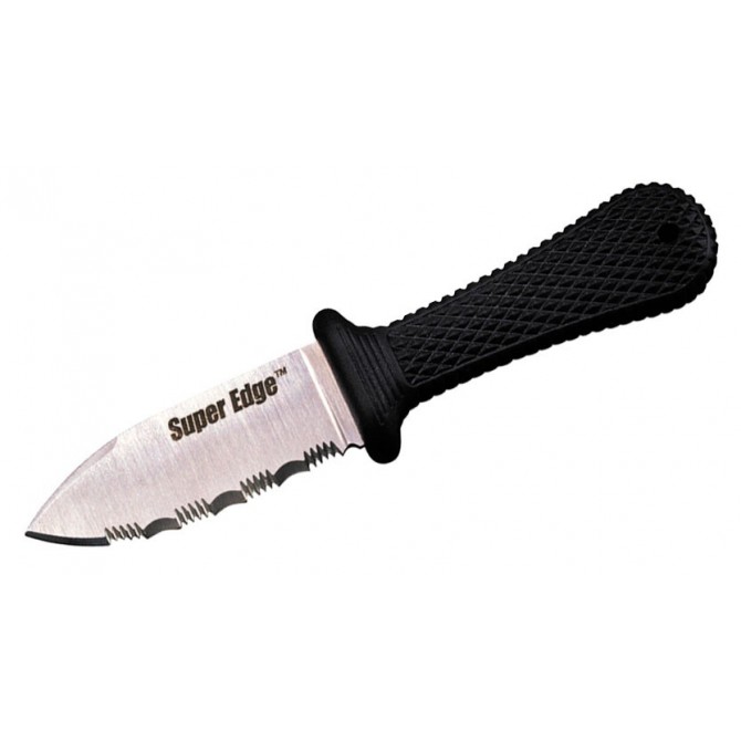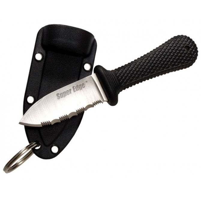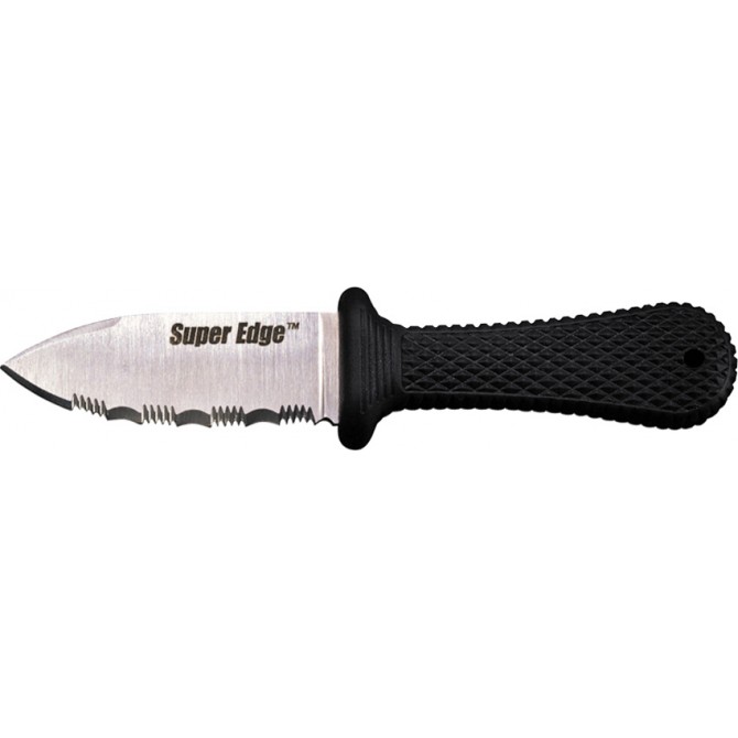 Cold Steel lanza el cuchillo Super Edge con hoja serrada estilo Spear Point fabricada en acero inoxidable AUS-8A. La empuñadura está diseñada en Kraton texturizado e incluye una funda de polímero en Secure-Ex para su transporte.