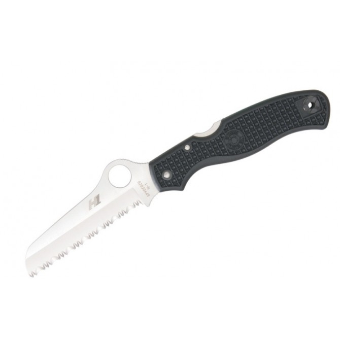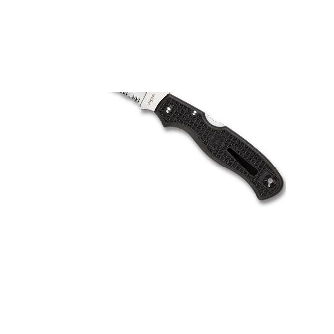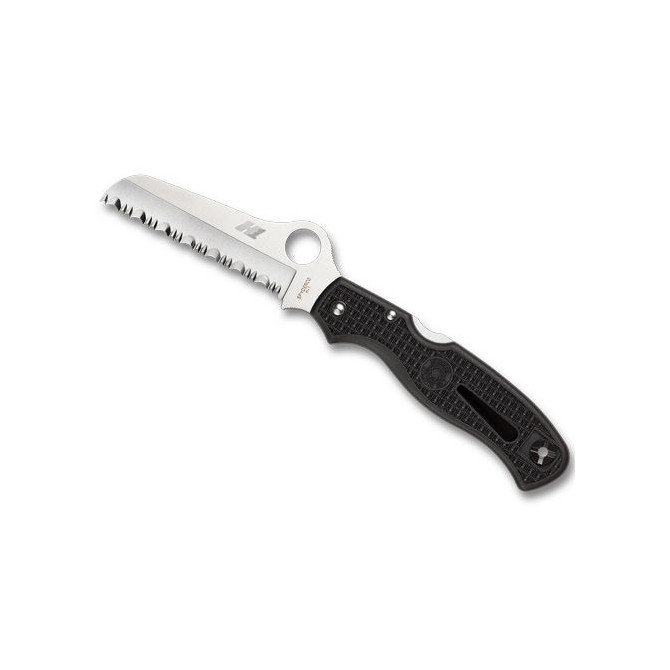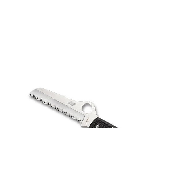 Spyderco ha diseñado la navaja de rescate Atlantic Salt Negra Serrada que destaca por su hoja de pie de oveja (Sheepsfoot). Este modelo está pensado para ambientes donde haya mucha oxidación. Cuenta con una hoja de acero inoxidable H1, cachas en FRN y bloqueo Back Lock.
