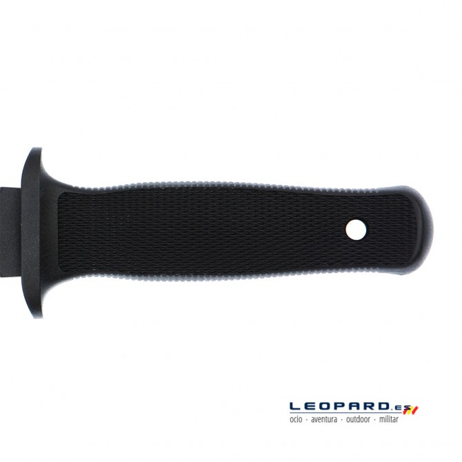 La empuñadura de este cuchillo está fabricada con el mismo material que la hoja. El Santoprene ofrece una gran durabilidad, así como una alta resistencia a muchos ácidos y soluciones acuosas.