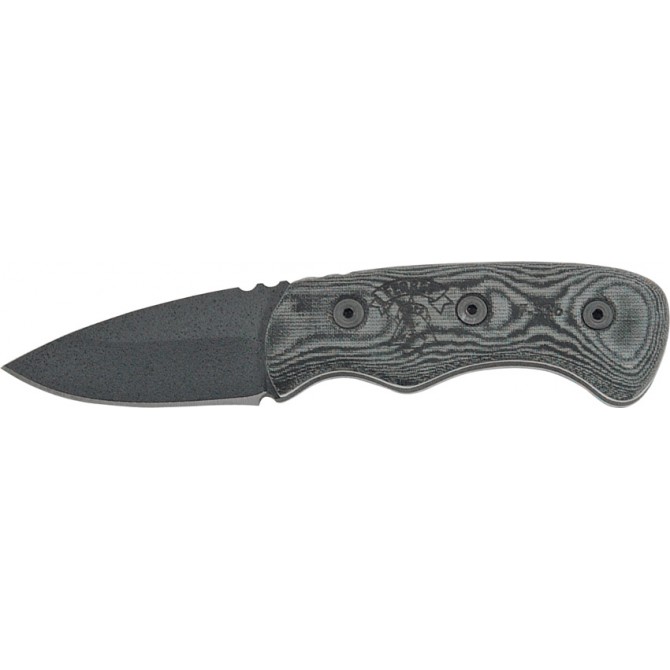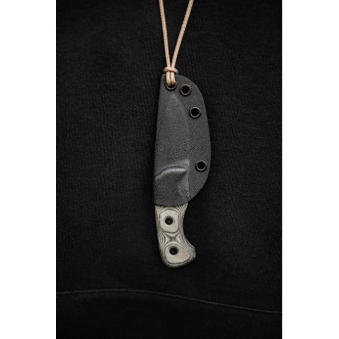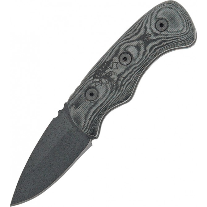 El equipo de desarrollo de Tops Knives ha escogido Micarta para la fabricación de la empuñadura de este cuchillo. Se trata de un material formado por láminas de tela impregnadas en resina de epoxi que después se tintan.
