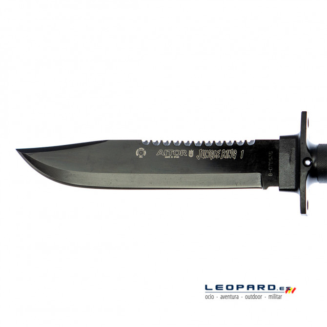 La conocida y famosa marca de cuchillos española Aitor trae el nuevo modelo Jungle King I con hoja de color negro. Está fabricada en acero X42Cr13, perfecto para cortes efectivos y precisos. Su estilo de hoja Clip Point y su empuñadura en acero inoxidable tratado rematan un cuchillo perfecto para entornos táctico-militares.