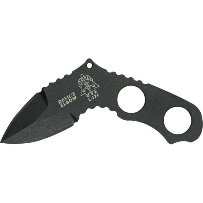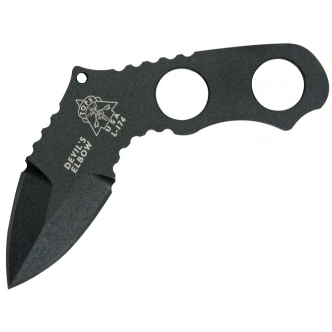 La compañía Tops Knives ha desarrollado el cuchillo táctico-militar Devil's Elbow, que cuenta con una hoja tipo Spear Point fabricada en acero 1095. La empuñadura está diseñada también en el mismo acero. Incorpora funda Kydex de color negro.