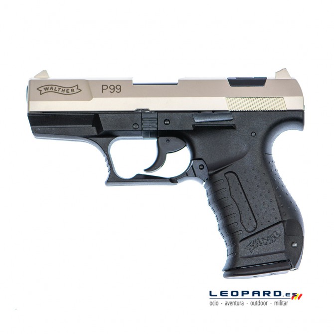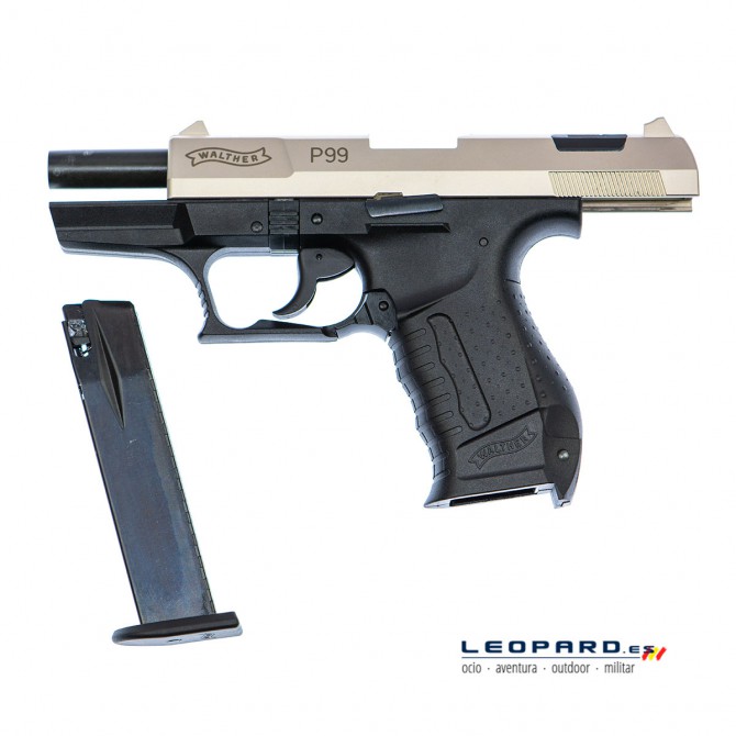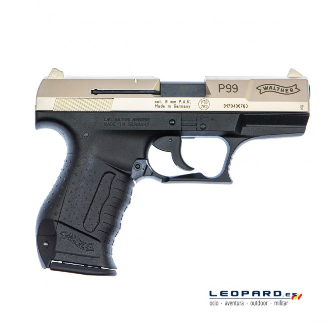 La pistola detonadora Walther P99, diseñada por Umarex en Alemania, dispara munición P.A.K. de 9 mm y el cargador tiene una capacidad de 15 cartuchos de fogueo. Dispone de un gatillo simple y de doble acción y seguro Decocker.