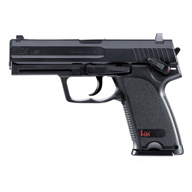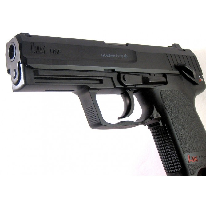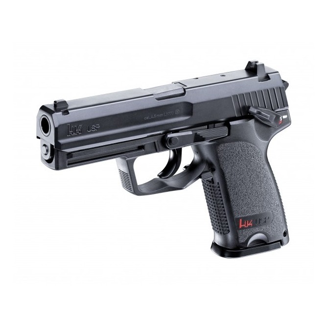 La H&K USP es una pistola alimentada por bombonas de Co2 de 12 gramos con un cargador con capacidad para 22 BBs, ideal para sesiones largas de tiro deportivo. Incorpora un cañón de acero liso e inoxidable con seguro automático, corredera fija y miras abiertas regulables.