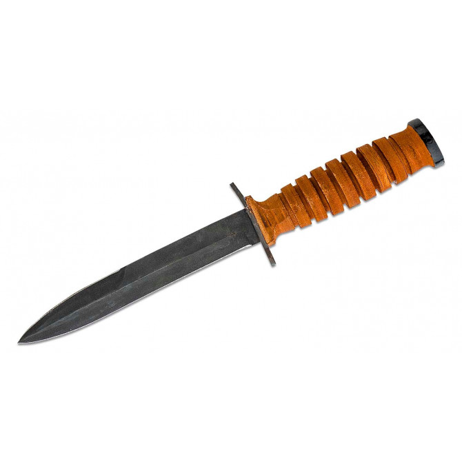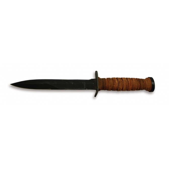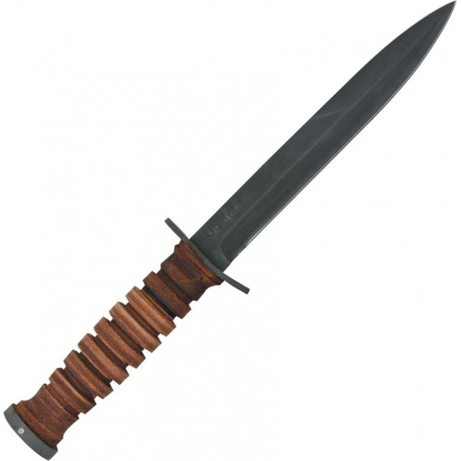 La compañía Ontario ha desarrollado el cuchillo Trench, que cuenta con una hoja tipo Spear Point en color negro fabricada en acero 1095. La empuñadura está diseñada en cuero al igual que la funda.